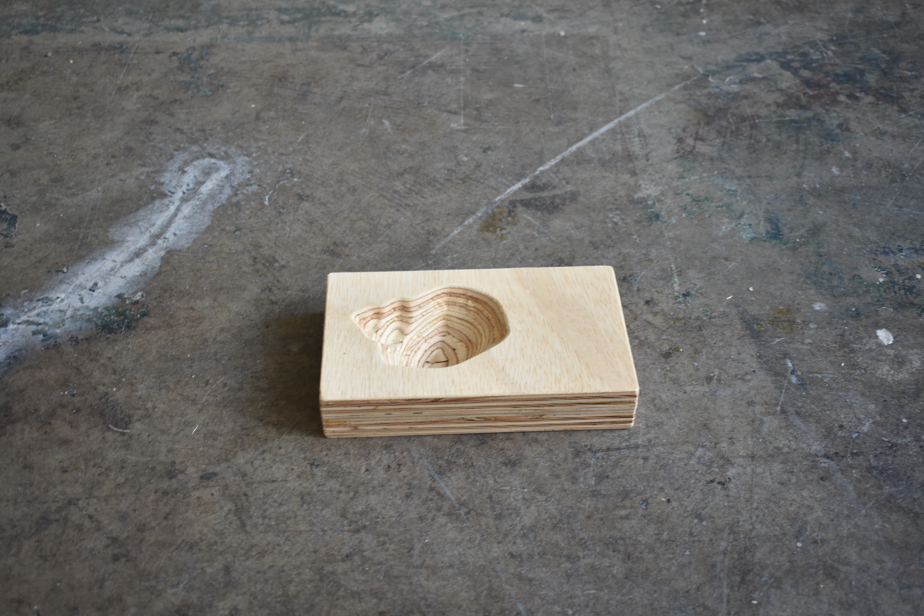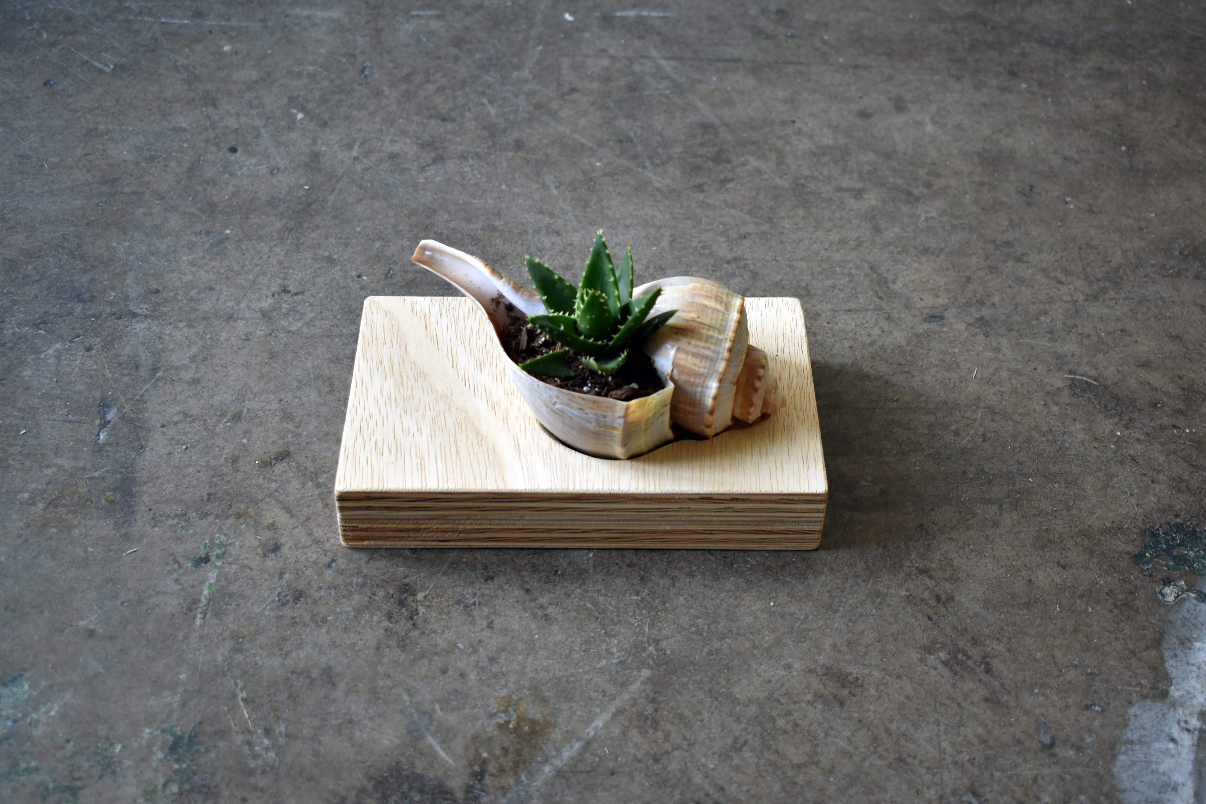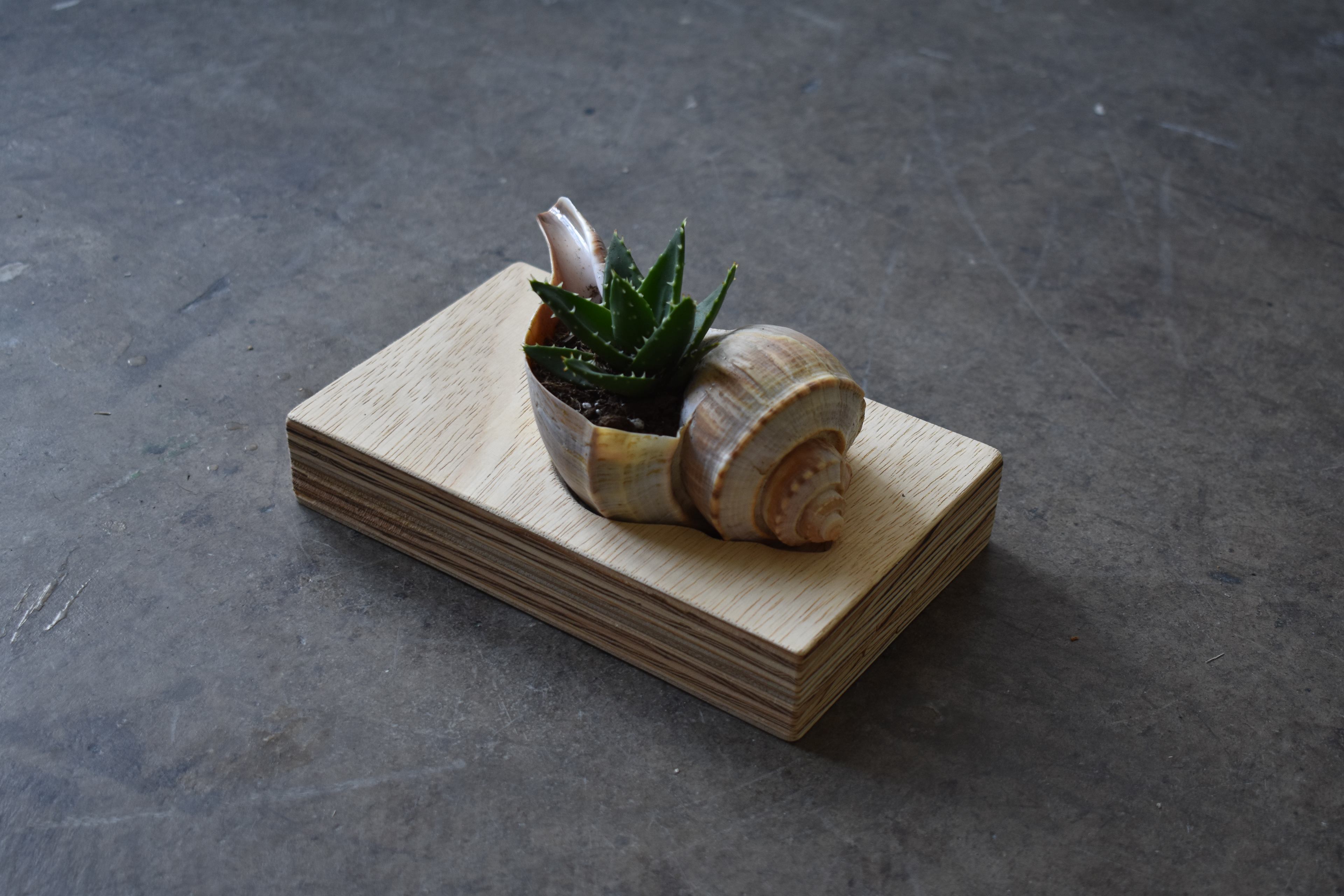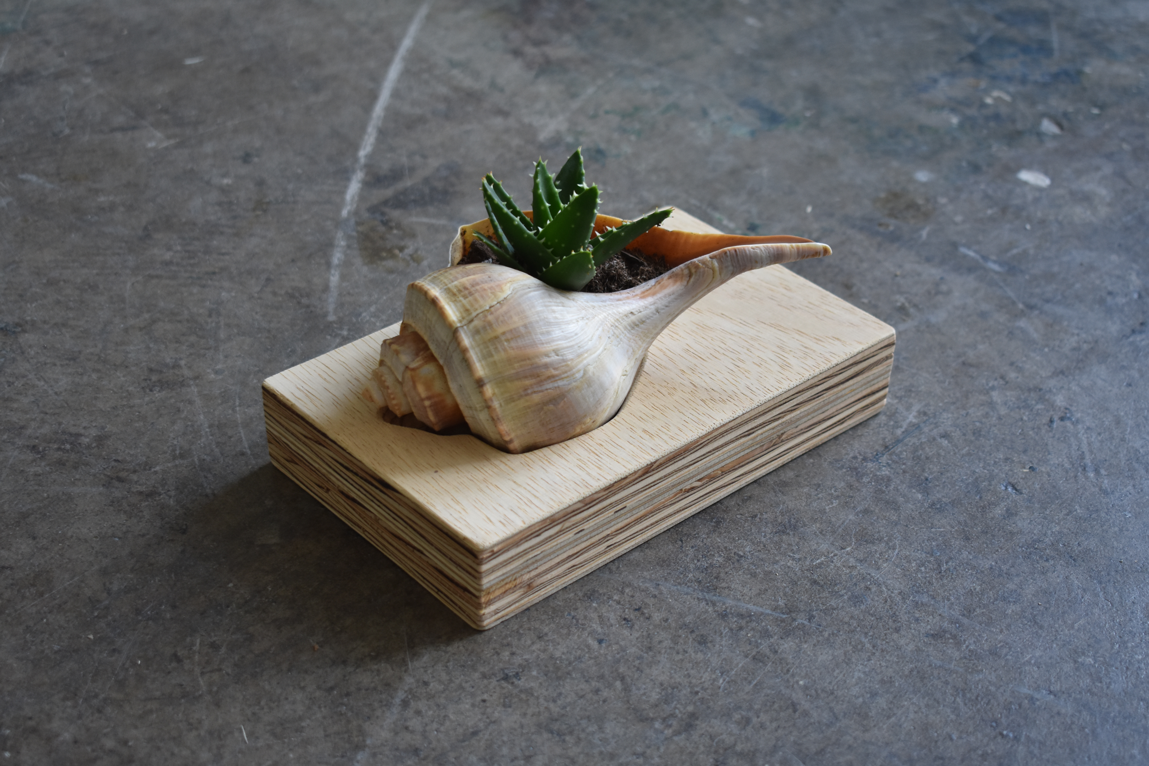 This project is a succulent planter which combines several digital fabrication strategies that I have been interested in for a while. The shell was 3D scanned using photogrammetry (using 3DF Zephyr) and transferred to Rhinoceros modeling space and used to form a CNC-routing file for the plywood base. After the plywood had been CNC-ed, it needed to be glued together and sanded down to hide the roughness of the routing as well as soften the sharp corners of the piece. The shell, which had been sourced from a restaurant, was razor sharp and jagged along the edge of the opening where the creature had been extracted. It was carefully chipped to a smoother profile, sanded down to blunt the edge, then polished for a cleaner look. With all of the pieces post-processed, all that was left to do was to find a succulent and make it feel at home.