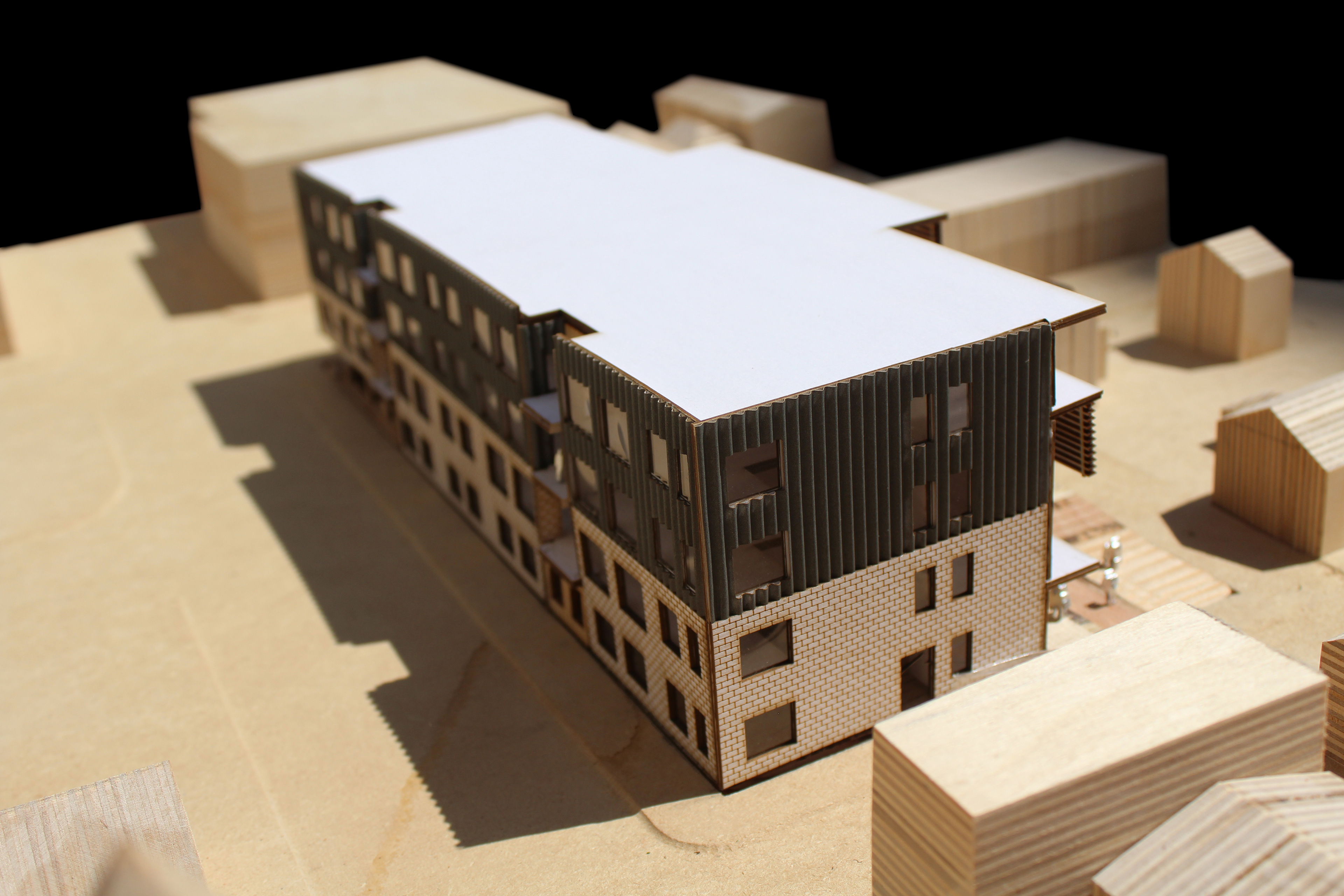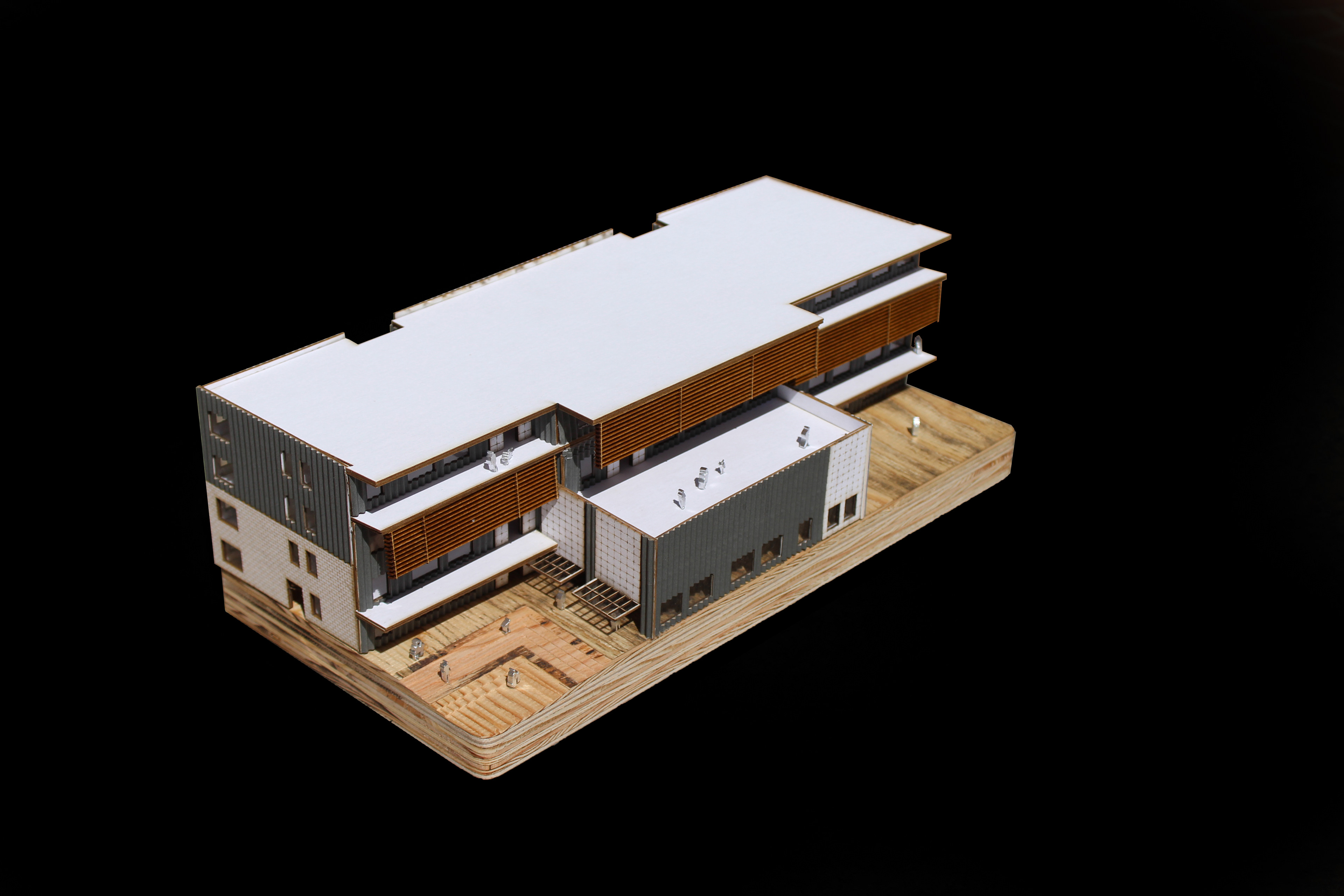 Given the commercial context to the north of and along Penn Avenue, the north facade maintains the tempo of the commercial hallway along the north street frontage using balconies and opening outdoor space along the north facade. Considering however, how the commercial zone to the north dissolves into a residential zone to the south, it was important to address this by also changing materiality from the commercial corrugated metal to brick which is more familiar to the residential houses to the south. This was also addressed by the drop in height from the commercial scale to the residential scale as the building approaches Comrie Way. The building attempts to break down its facade from the formal response to the Penn Avenue context to a smaller scale along the southern facade. This transition also uses the east and west facades as gradients to begin this transformation and dissolving to the south.